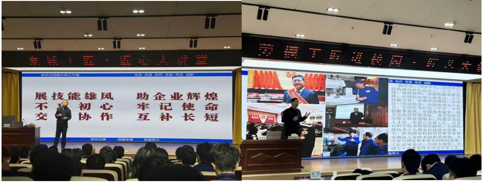 揭牌仪式后,张东元和郭晋龙结合自身成长经历与从业经历开展分享交流。张东元以“攻关、交流、协作、传承、传艺、创新”为主题,结合习近平总书记在清华大学考察时的重要讲话,围绕“什么是真正的职业教育”展开分享。郭晋龙以个人成长奋斗历程为鲜活案例,勉励高职学子珍惜当下学习平台,不惧质疑、脚踏实地,以匠心守初心,用技能报家国,坚定成才信念。