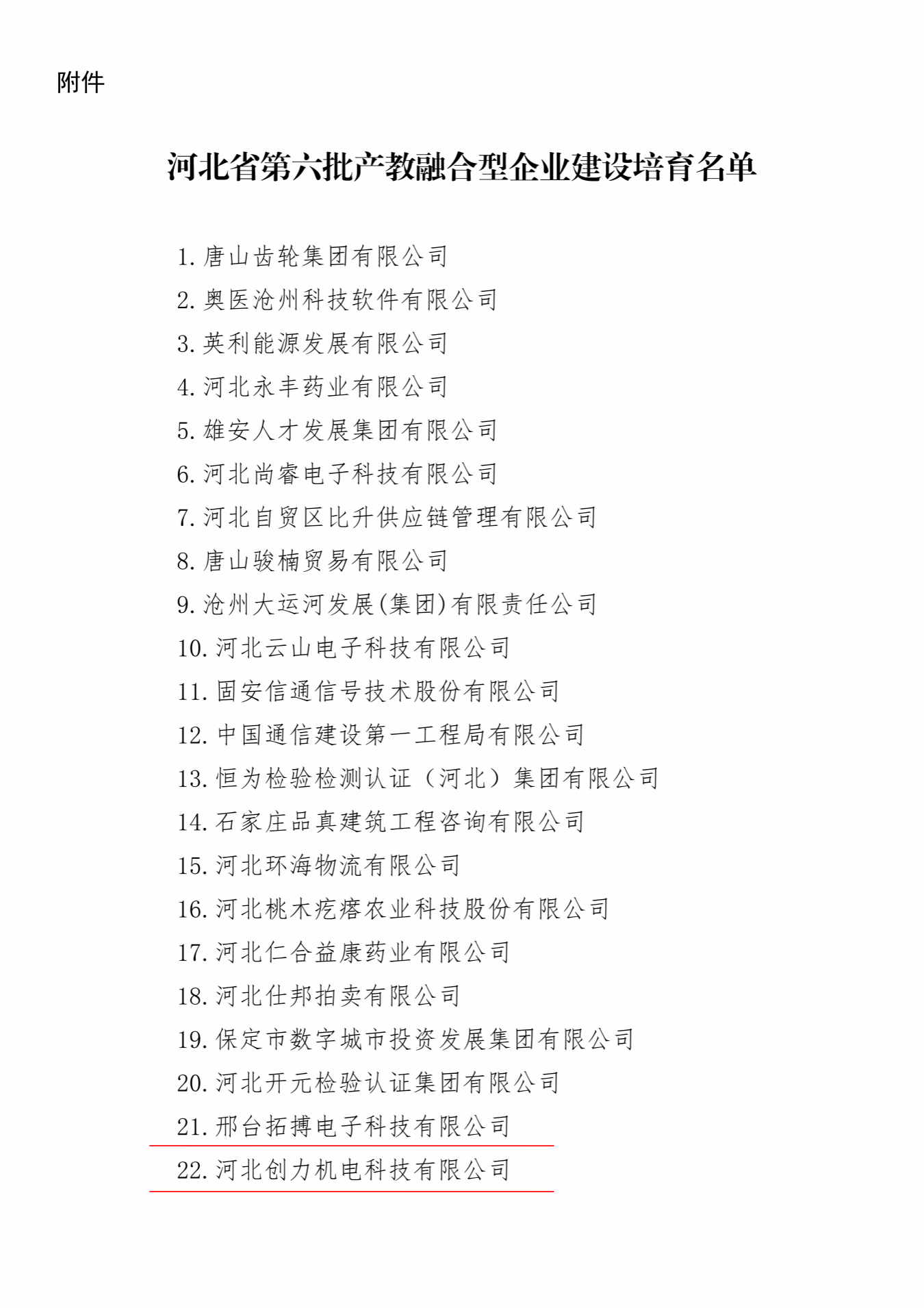 近日,河北省发展和改革委员会、河北省教育厅联合公示第六批产教融合型企业建设培育名单。我校深度合作企业——邢台拓搏电子科技有限公司与河北创力机电科技有限公司凭借扎实的产教融合成果,经严格评审成功入选。这标志着我校在深化校企协同育人、服务地方产业发展方面取得实质性突破,也为区域产教融合树立了校企合作的新典范。