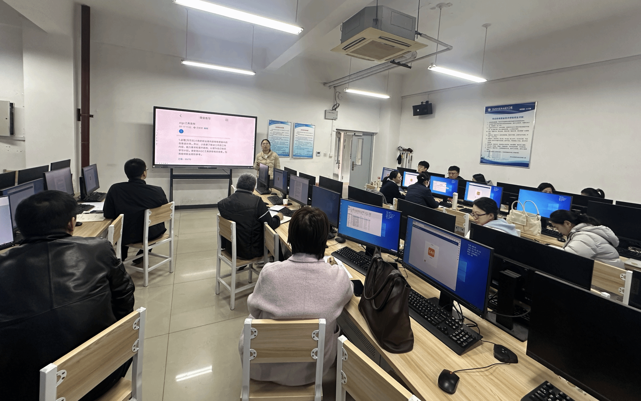 为响应国家“人工智能+”行动与数字化人才培养战略部署,探索AI与教学深度融合的有效路径,11月23日上午财会与管理工程系在7号楼307教室,进行“AI融入教学”优秀案例评选活动。15位参赛教师依次登台汇报,展现了AI技术赋能商科教学的创新实践与丰硕成果。