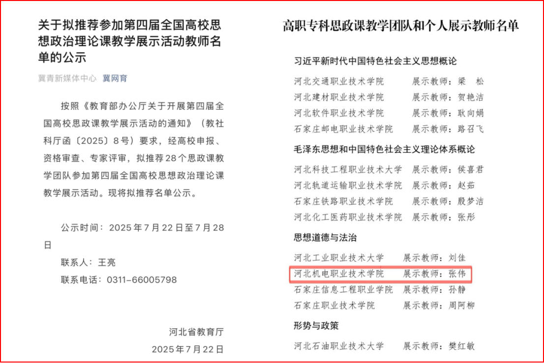 全国高校思想政治理论课教学展示活动由教育部主办,是检验思政课教学质量、展示教学改革成果、促进教师队伍建设的国家级重要平台。此次河北省推荐名单按照《教育部办公厅关于开展第四届全国高校思政课教学展示活动的通知》(教社科厅函〔2025〕8号)要求,经高校申报、资格审查、专家评审,竞争激烈。由思想道德与法治教研室主任吴平芳作为团队带头人,张伟作为个人展示教师,师新荣、王静、程乔乔和郝玉四位专任教师组成的参赛团队在全省高职院校中脱颖而出,充分展现了该团队多年深耕《思想道德与法治》课程建设取得的优秀成效。