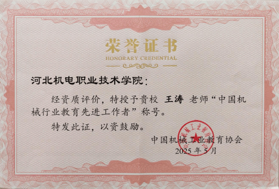 图2. 王涛教师荣获“中国机械行业教育先进工作者”称号